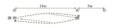 Player 1 starts with the ball in his hand and runs towards Player 2 at B. Half way acriss he rolls the ball along the ground in front of player 2 and then follows the ball to cone B and takes his position there.