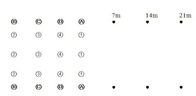 Set up 4 cones in a line about 5m apart as shown by cones A, B, C and D below. Each of these cones will be a station on the circuit. Outside of cone A place three more markers at distances of 7m, 14m and 21m. The set-up here shows three groups.